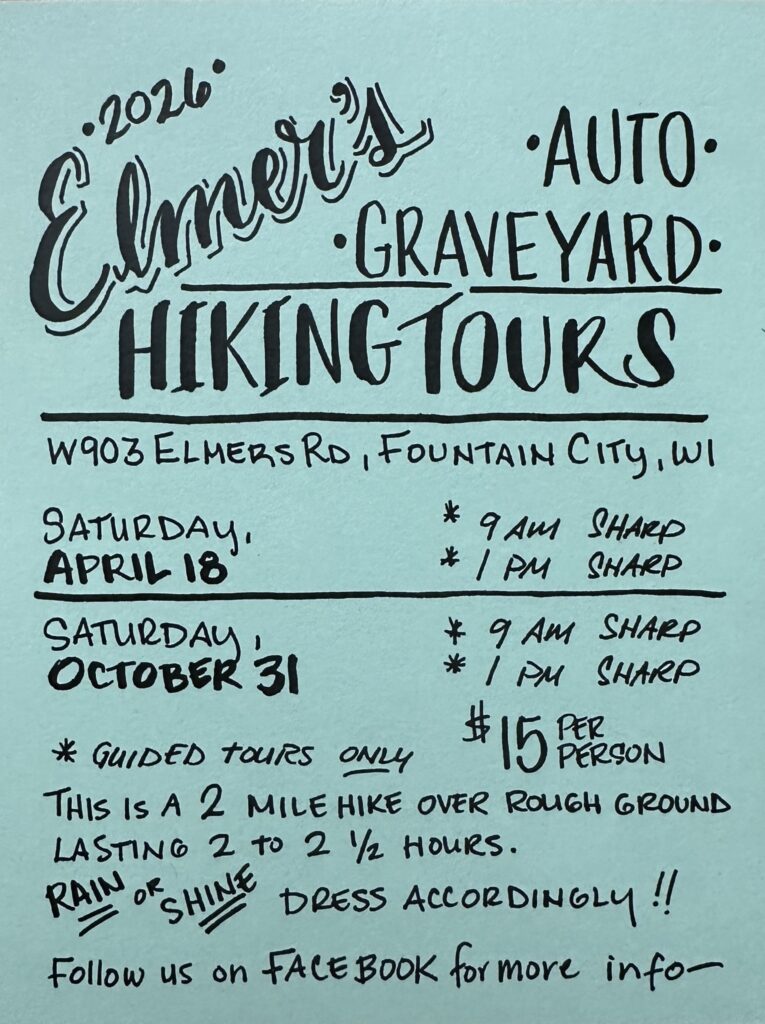 Hiking tour thru the old car sections of Elmer’s Auto Salvage in Fountain City, Wi.
