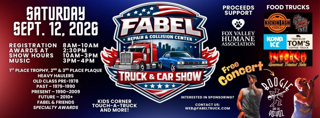 Revving Up for 35 Years: Past, Present & Future is a community truck and car show celebrating 35 years of Fabel Repair & Collision Center, a family-owned business proudly serving Northeast Wisconsin since 1991.