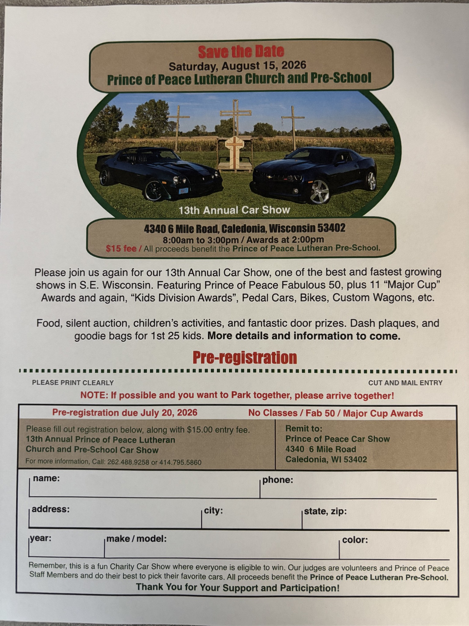 Prince of Peace Car Show – Caledonia – 8/15/2026