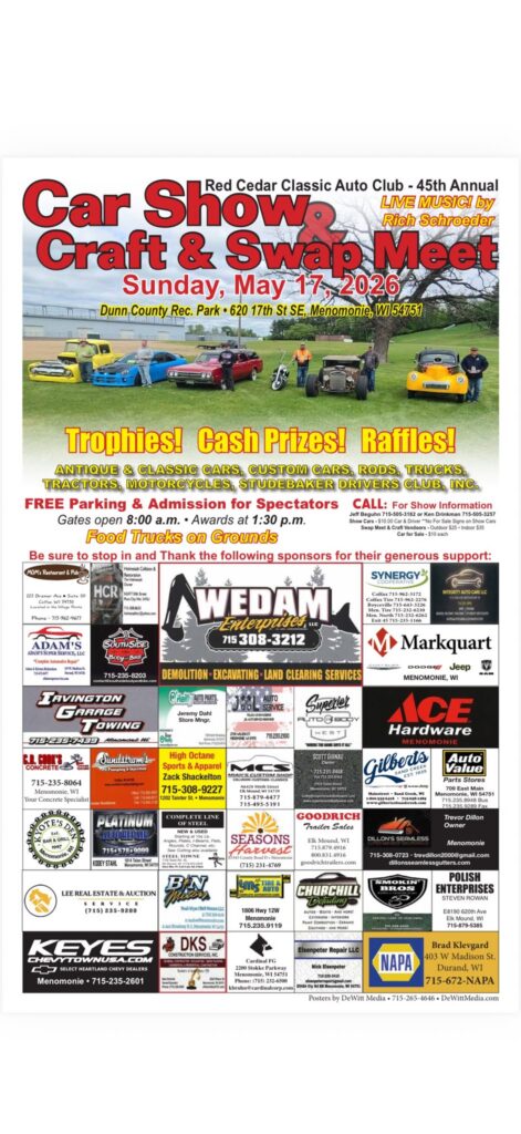 Show car + driver: $10 Car for sale: $10 Swap meet + Craft Vendors: Outdoor $25. Indoor $35