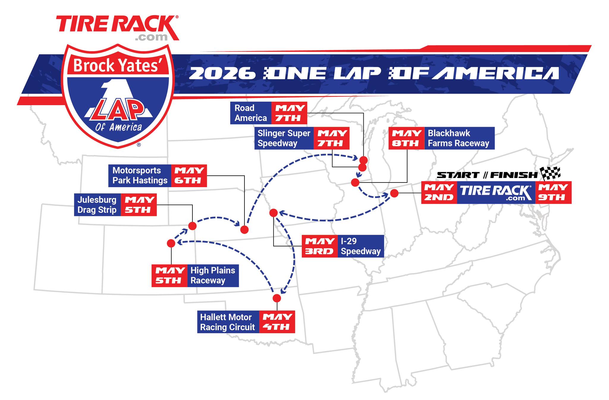 The Brock Yates’/Tire Rack One Lap of America will be having events at Road America and Slinger Speedway on May 7th.