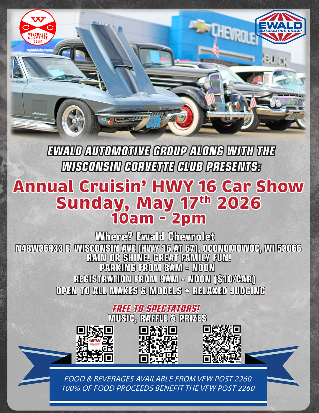 Ewald Chevrolet - Oconomowoc 36833 East Wisconsin Ave, Oconomowoc, United StatesPresented by Ewald Auto Group and Wisconsin Corvette Club Rain or Shine Open to all makes and models $10 registration