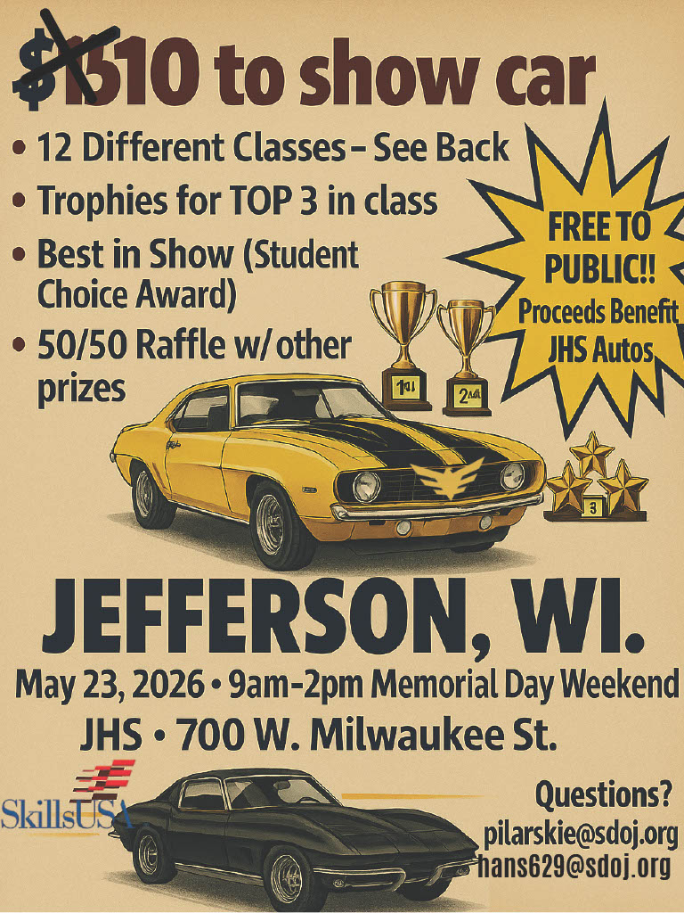 May 23 Jefferson High School Car Show – 5/23/2026 9:00 am - 2:00 pm Jefferson High School 700 W Milwaukee St, Jefferson Event Details Get Directions