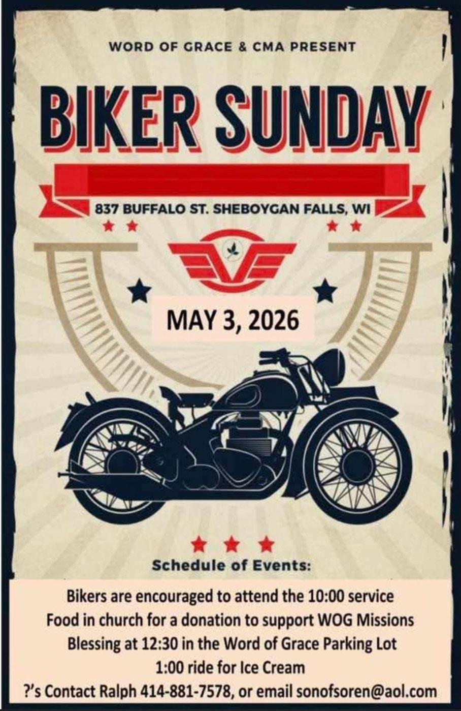 May 3 Biker Sunday – Sheboygan Falls – 5/3/2026 10:00 am - 1:00 pm Word of Grace - Sheboygan Falls 837 Buffalo St, Sheboygan Falls Event Details Get Directions
