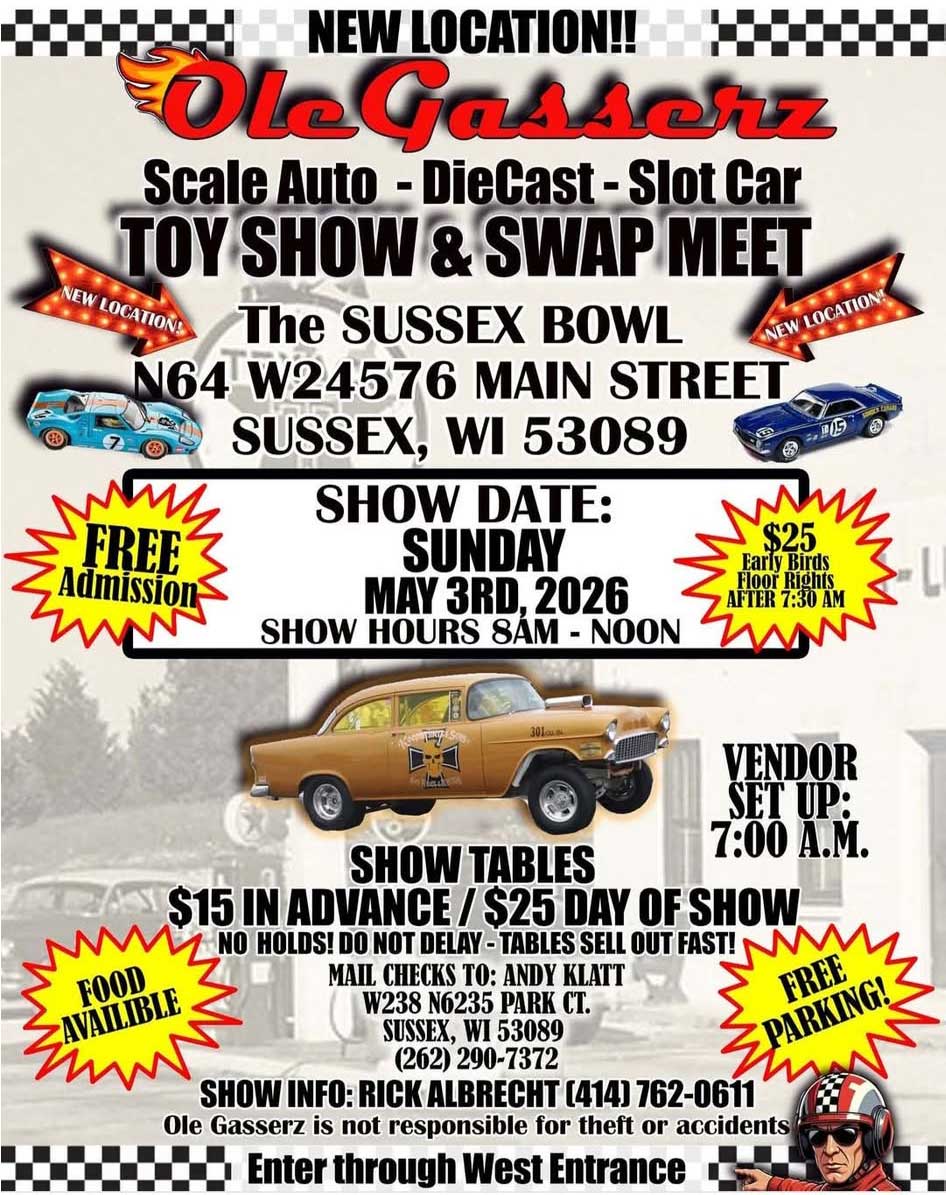 Scale Auto Slot car,Diecast, Hotwheels Decals, Show cars, Food and drink available Free admission - but, $25 for early entry Show Tables sell out fast - see flyer