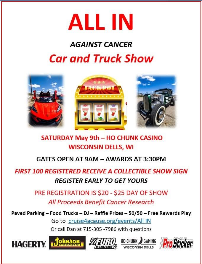 Pre-Registration $20 - https://cruise4acause.org/calendar/all-in-against-cancer-car-and-truck-show/ $25 day of show