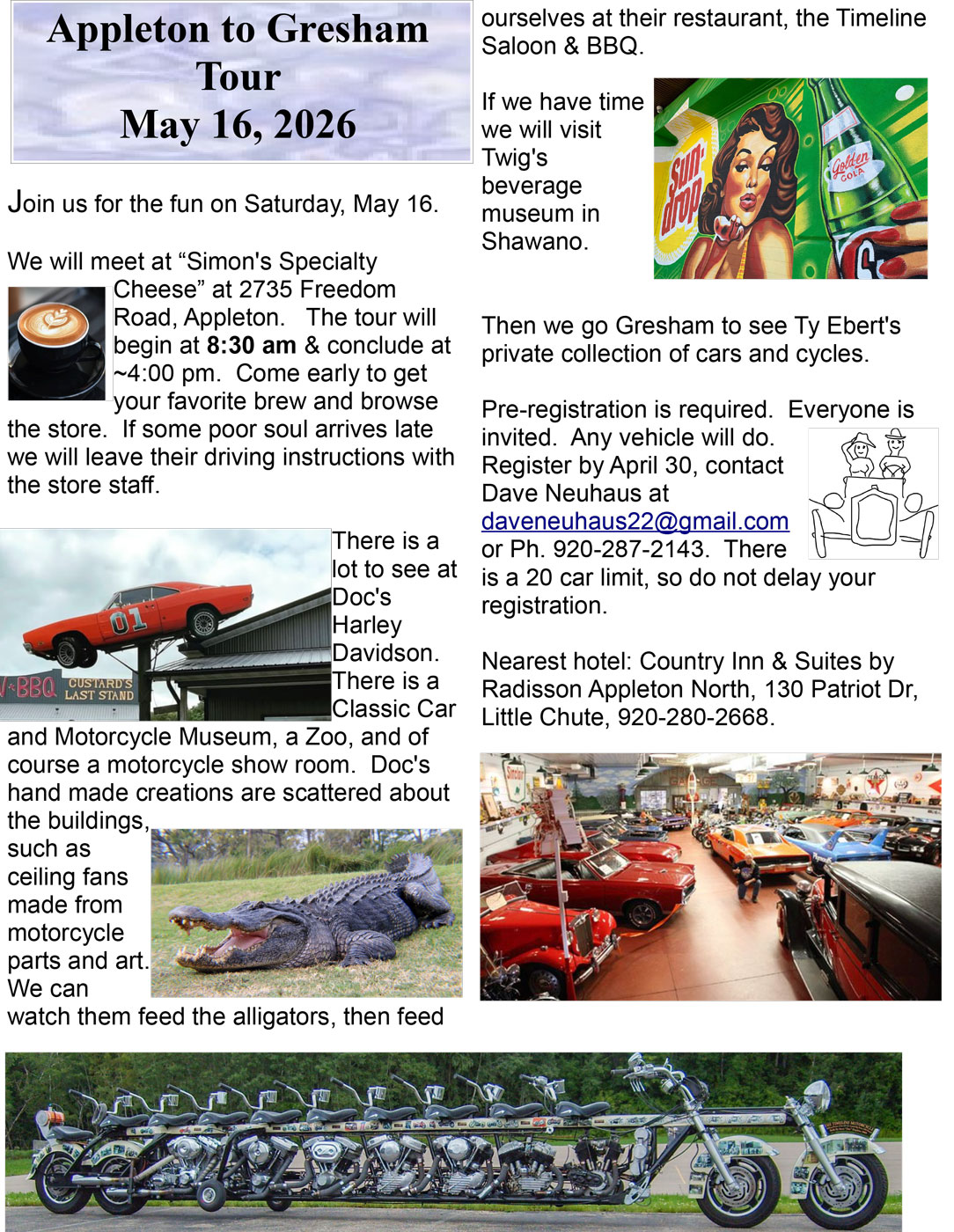 Starting from Simon's Specialty Cheese, Appleton Doc's Harley Timeline Saloon Twig's Beverage Museum End in Gresham Pre-registration required by April 30th - https://wisautotours.weebly.com/future-tours.html