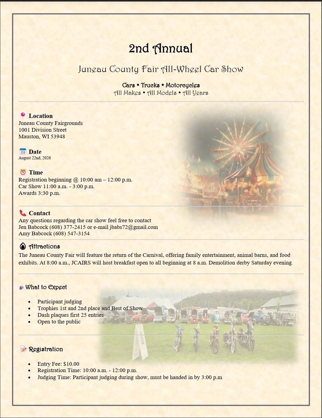 Car Shows Downtown on BRIDGE STREET -ENTER FROM SPRING STREET -VOLUNTEERS WILL DIRECT YOU August 8th - PARADE-STAGE AT NORTHERN WISCONSIN STATE FAIRGROUNDS AT NOON CARS WILL FOLLOW THE PARADE & PARK ON BRIDGE STREET UNTIL 3:30PM