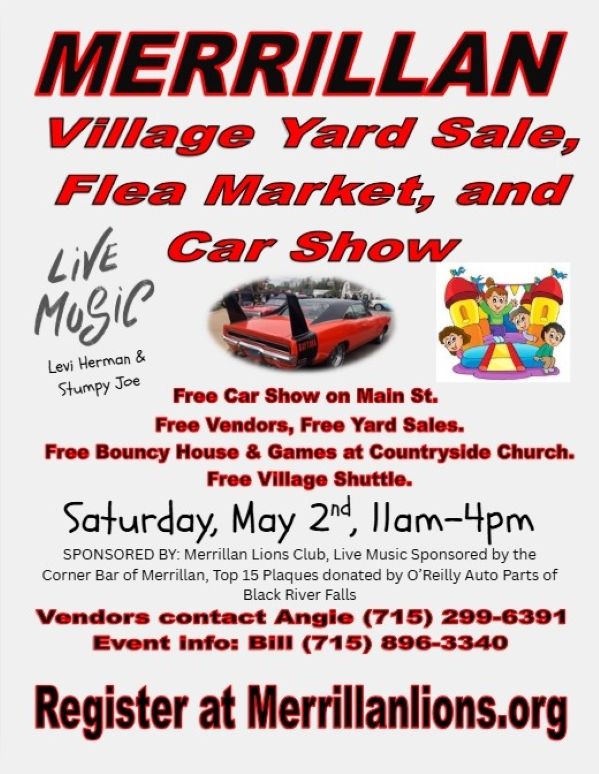 May 2 Car Show, Yard Sale, Flea Market – Merrillan – 5/2/2026 11:00 am - 4:00 pm Corner Bar - Merrillan 200 N Main St, Merrillan Event Details Get Directions