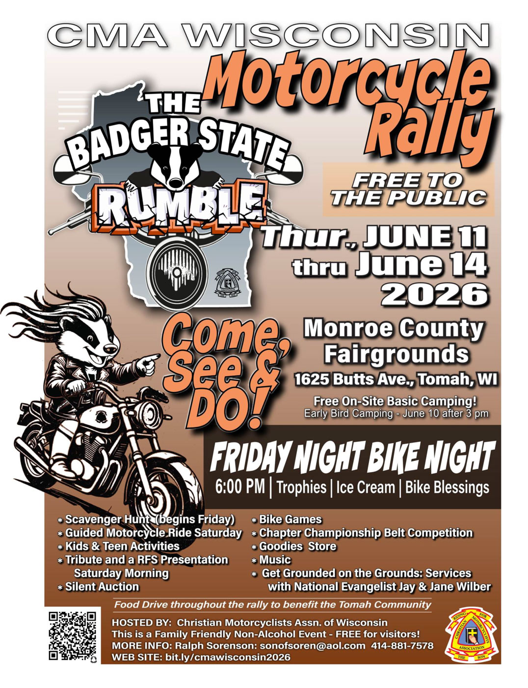 Jun 11 Badger State Rumble Motorcycle Rally – Tomah – 6/11 thru 6/14/2026 June 11 - June 14 Monroe County Fairground 1625 Butts Ave, Tomah Event Details Get Directions