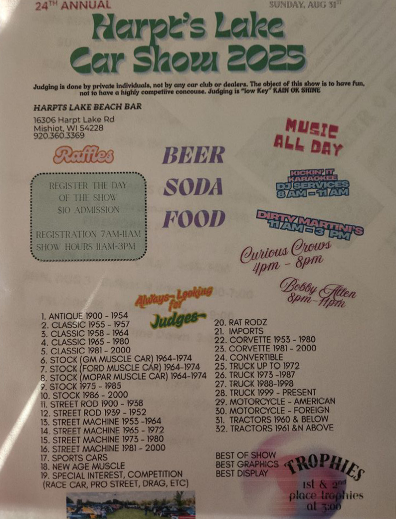 Aug 31 7:00 am - 3:00 pm Harpt’s Lake Car SHow – Mishicot – 8/31/2025 Harpts Lake Beach Bar 16306 Harpt Lake Road, Michicot Event Details Get Directions