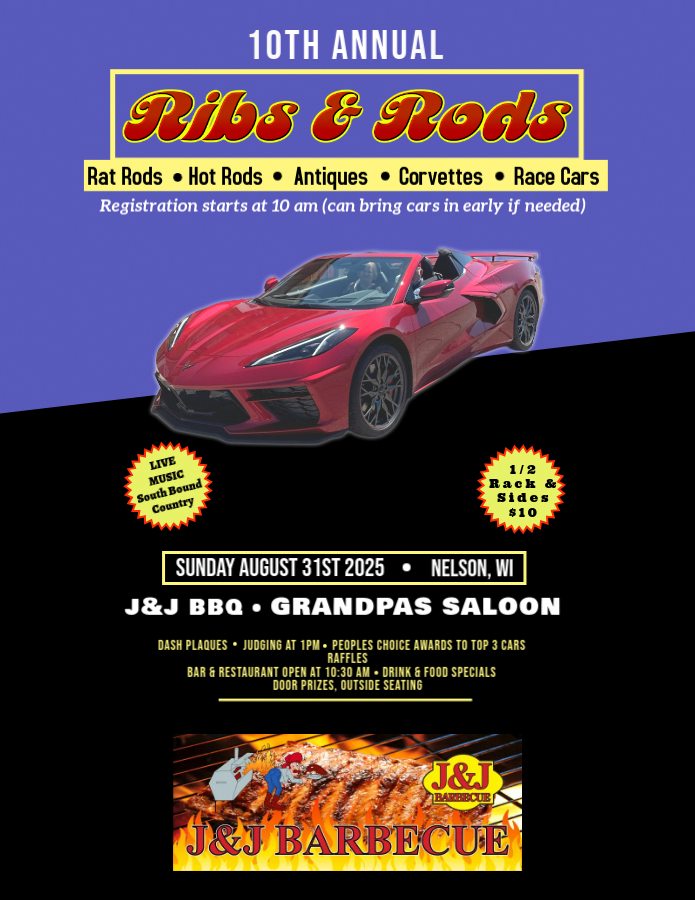 Aug 31 10:00 am - 1:00 pm Ribs and Rods Car SHow – Nelson – 8/31/2025 J & J BBQ - Nelson N208 N Main St, Nelson Event Details Get Directions