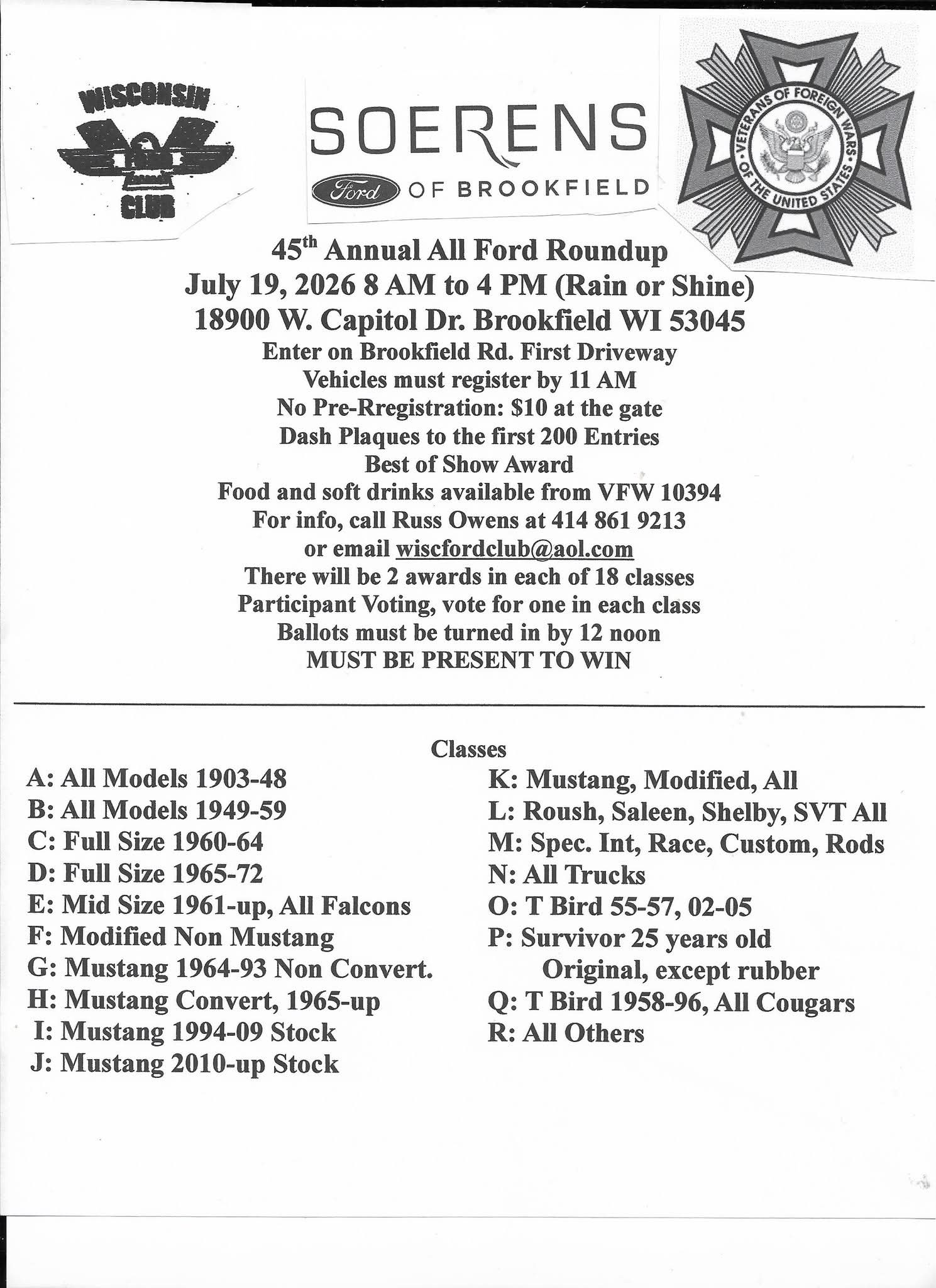 Rain or Shine Enter on Brookfield Rd. First Driveway Vehicles must register by 11 AM No Pre-registration: $10 at the gate Food and soft drinks available from VFW 10394 |